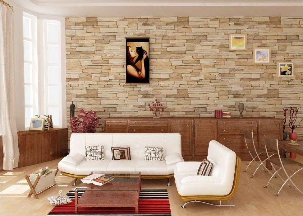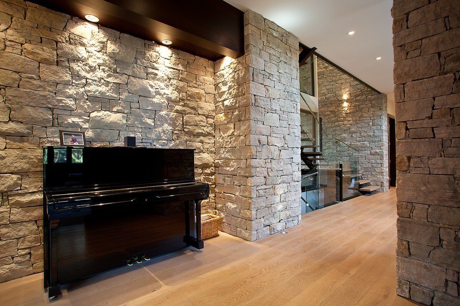 Для того чтобы облицовка смотрелась по-настоящему красиво, нужно учесть одну ее особенность. Потребуется достаточно яркое освещение, иначе комната будет выглядеть несколько мрачноватой. Решить эту проблему можно, укладывая камень не всплошную, а чередуя его с однотонными обоями, краской или декоративной штукатуркой светлого оттенка